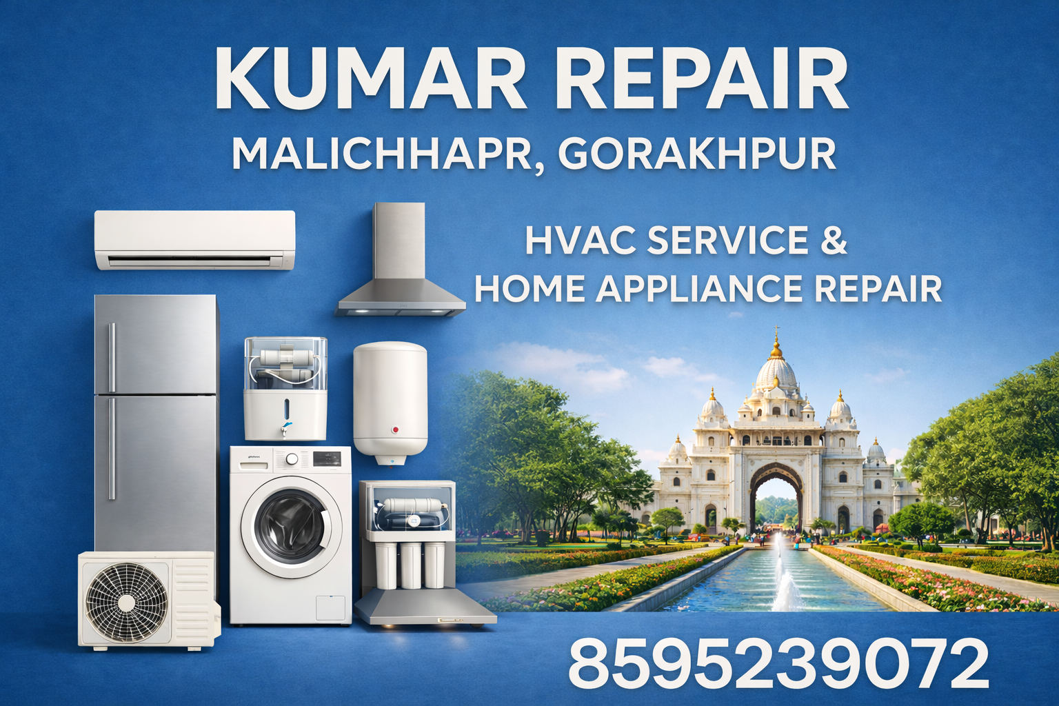 Kumar Repair is a trusted home appliances and HVAC service company serving Delhi, Noida, Ghaziabad, and Siwan, Bihar, Malichhapr, Gorakhpur. Founded by Muntun Kumar, the company specializes in AC, fridge, RO, washing machine, microwave, chimney, and geyser repair, along with expert HVAC solutions, including VRV/VRF systems, cold storage installation, and commercial cooling services. With skilled technicians, fast response, and transparent pricing, Kumar Repair ensures reliable, high-quality service for homes, shops, and businesses. The company is known for its professionalism, genuine spare parts, and commitment to customer satisfaction, making it a dependable choice for all appliance and HVAC needs.